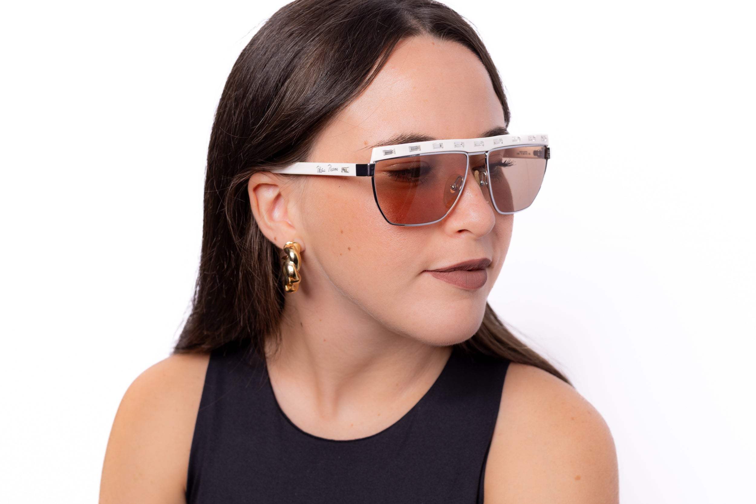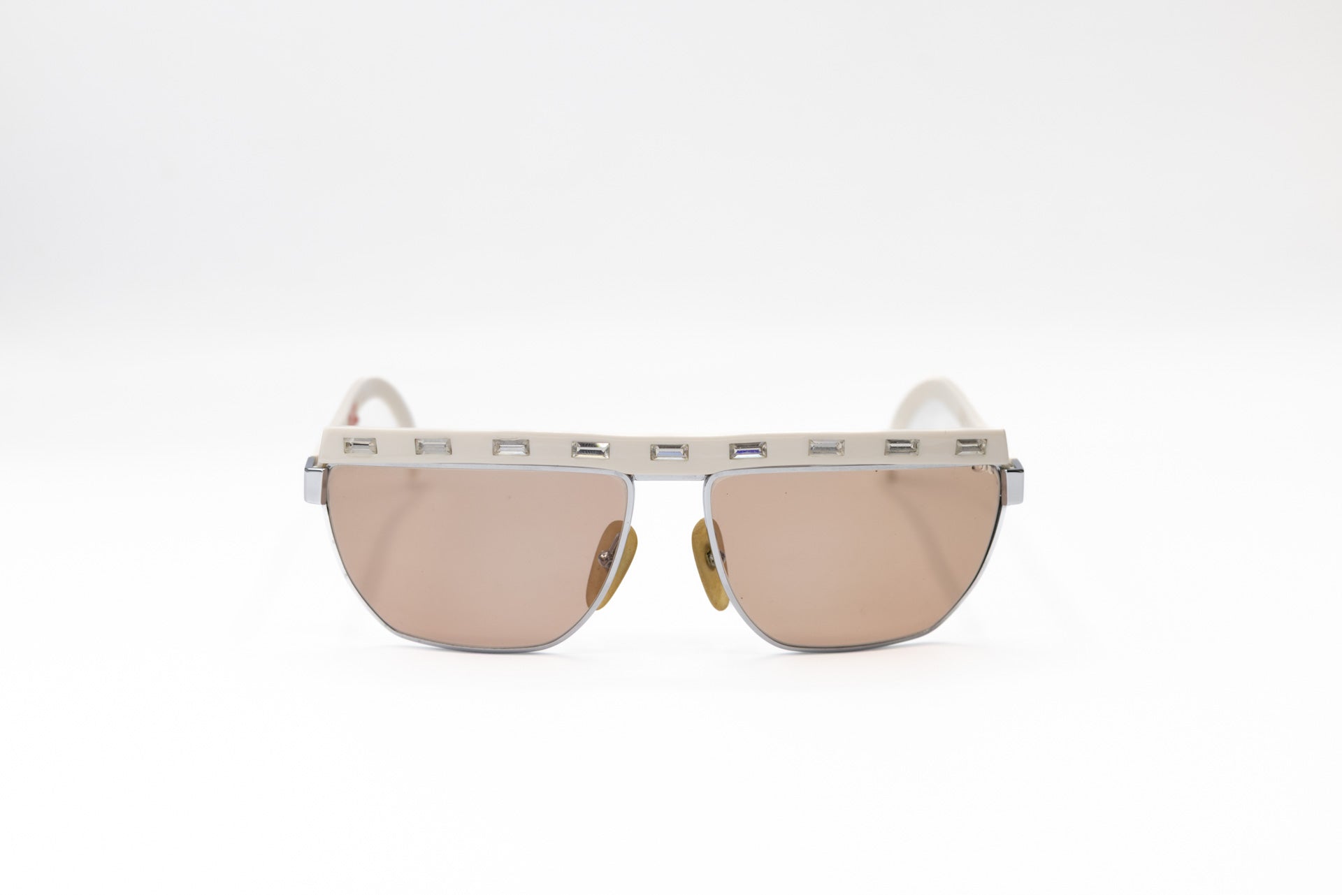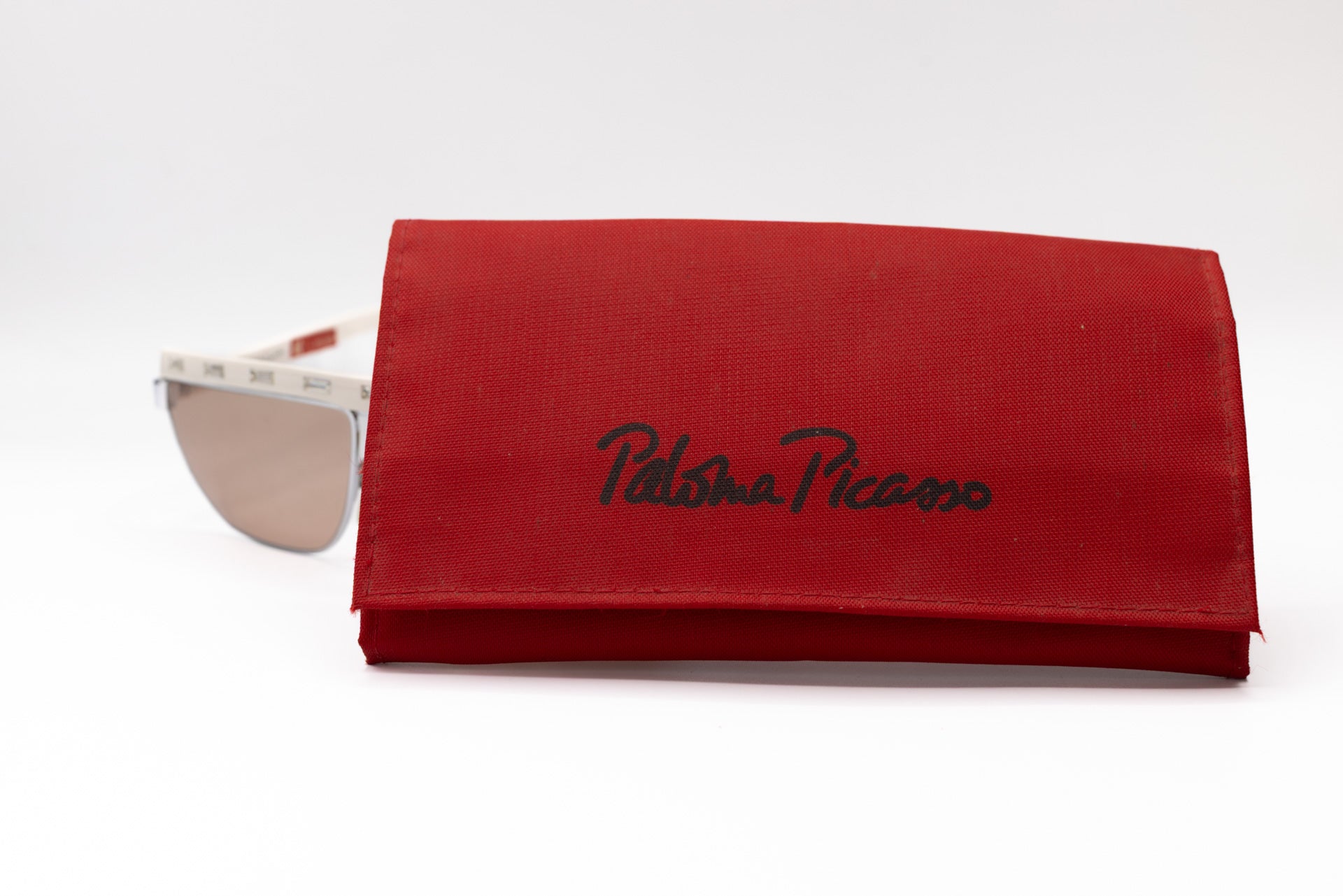 This 90s vintage sunglasses by Paloma Picasso feature a fancy white design, including a metal frame with a top line enhanced by rhinestones and temples in translucent acetate. Comes with original Paloma Picasso red case. Does it get more 90s than this?