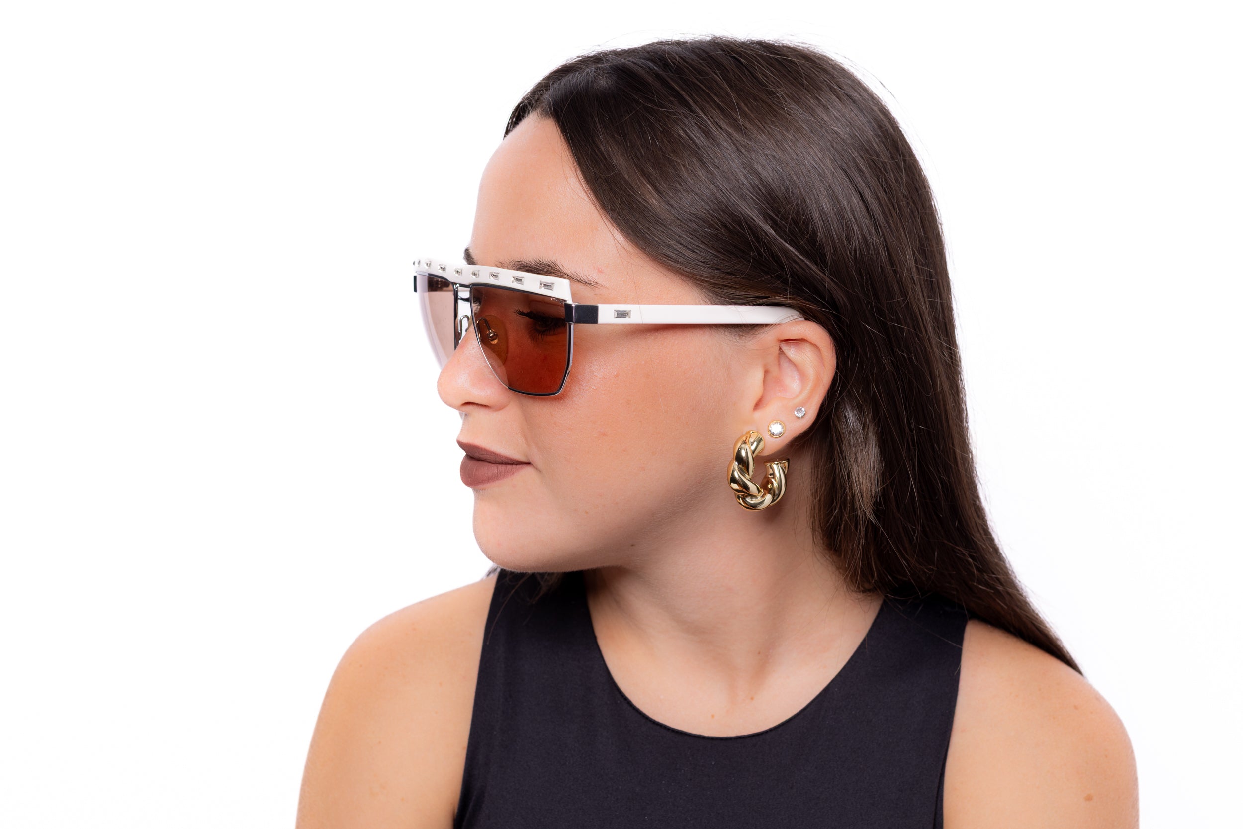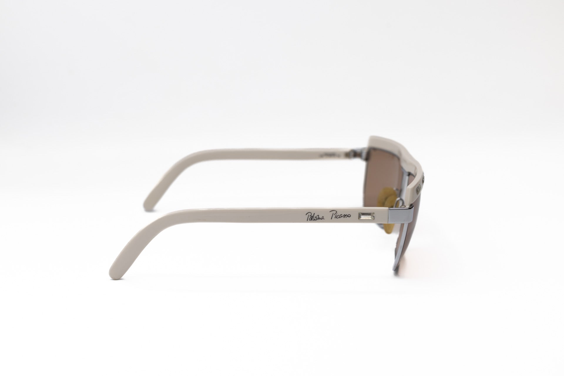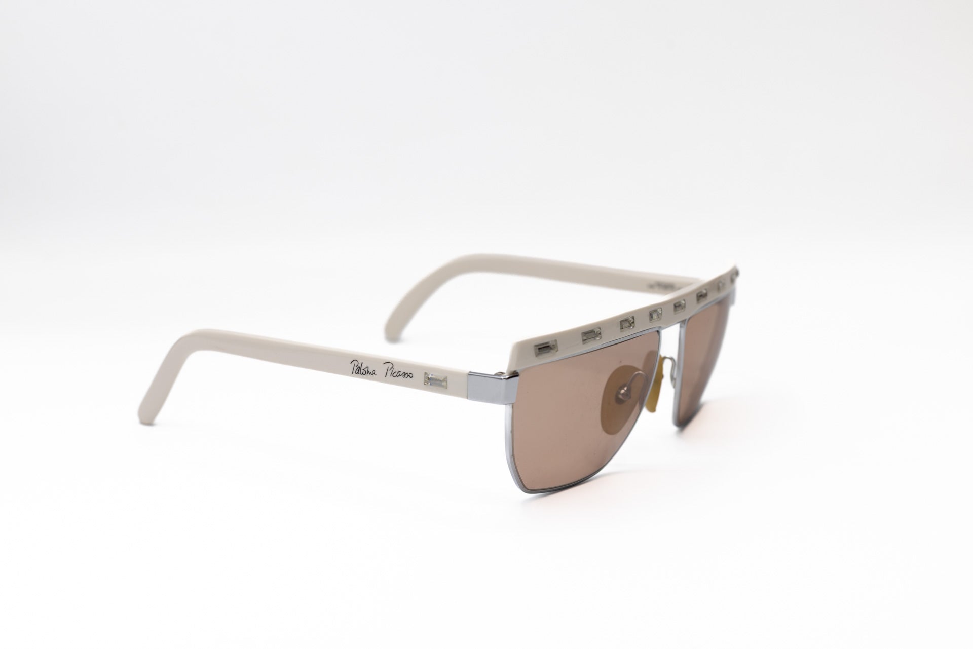 This 90s vintage sunglasses by Paloma Picasso feature a fancy white design, including a metal frame with a top line enhanced by rhinestones and temples in translucent acetate. Comes with original Paloma Picasso red case. Does it get more 90s than this?