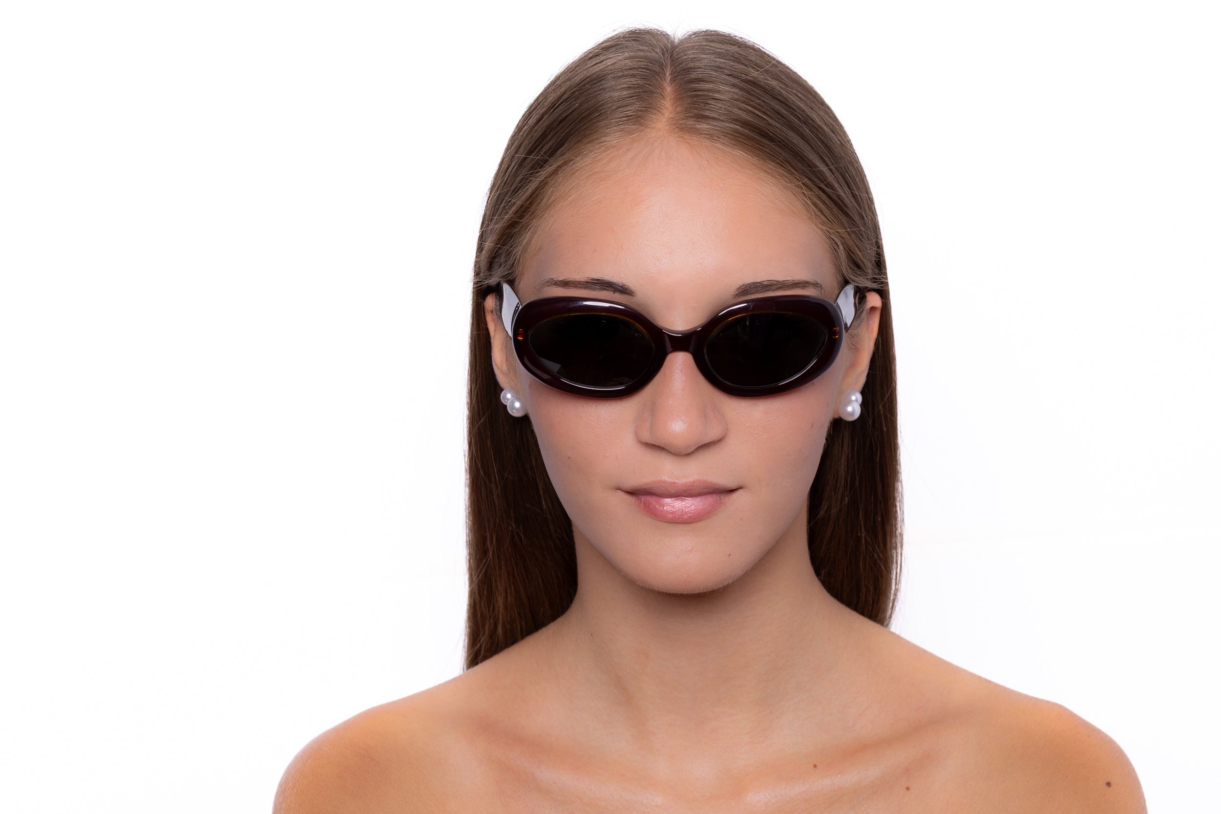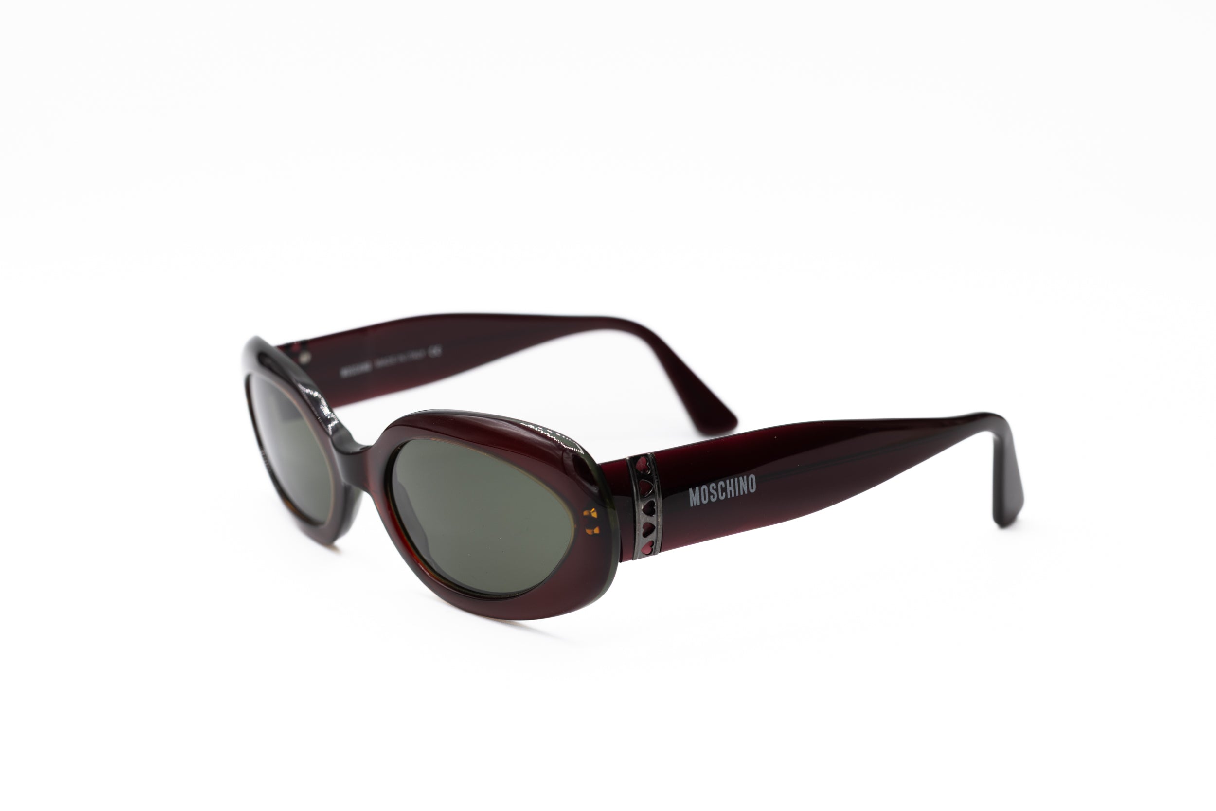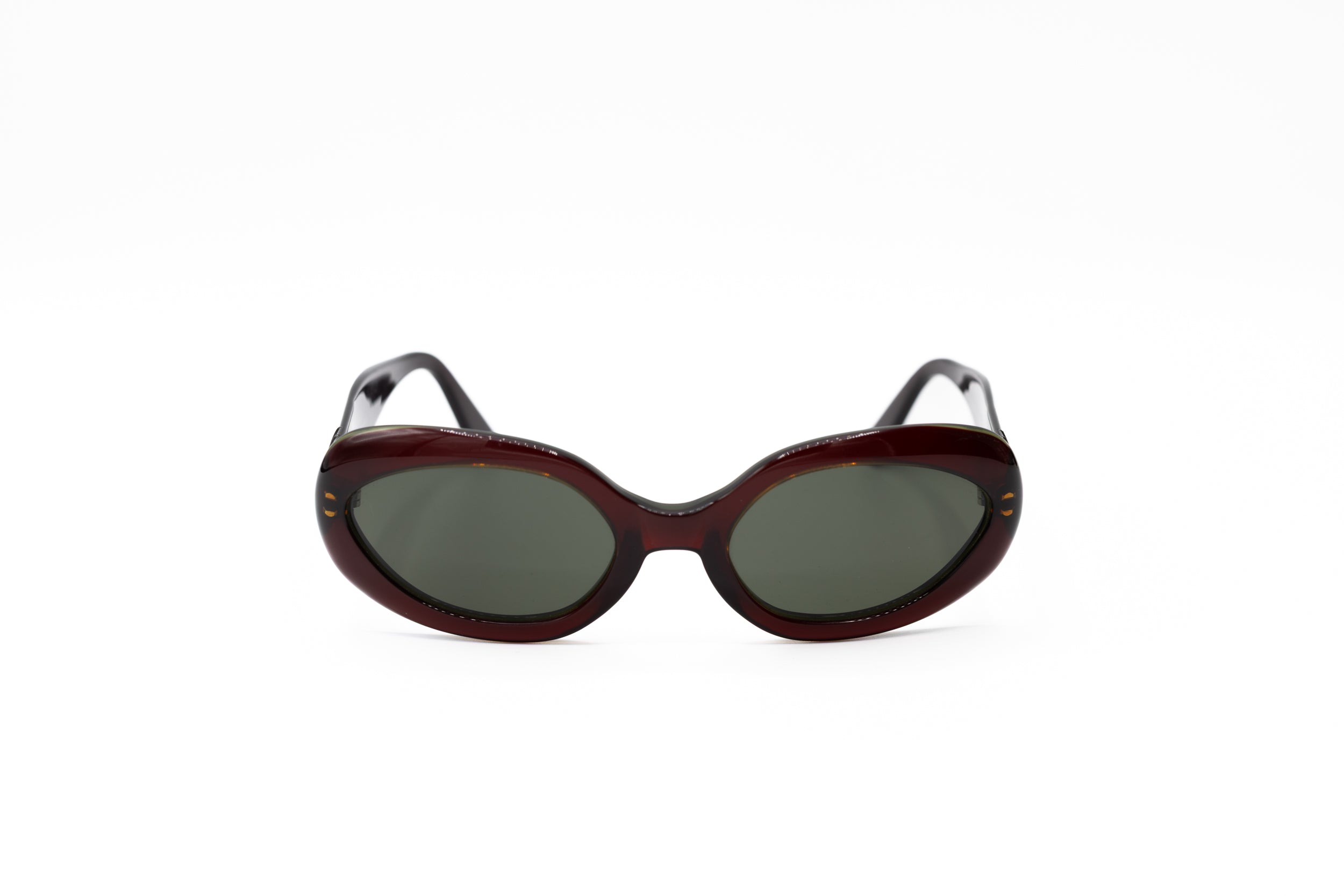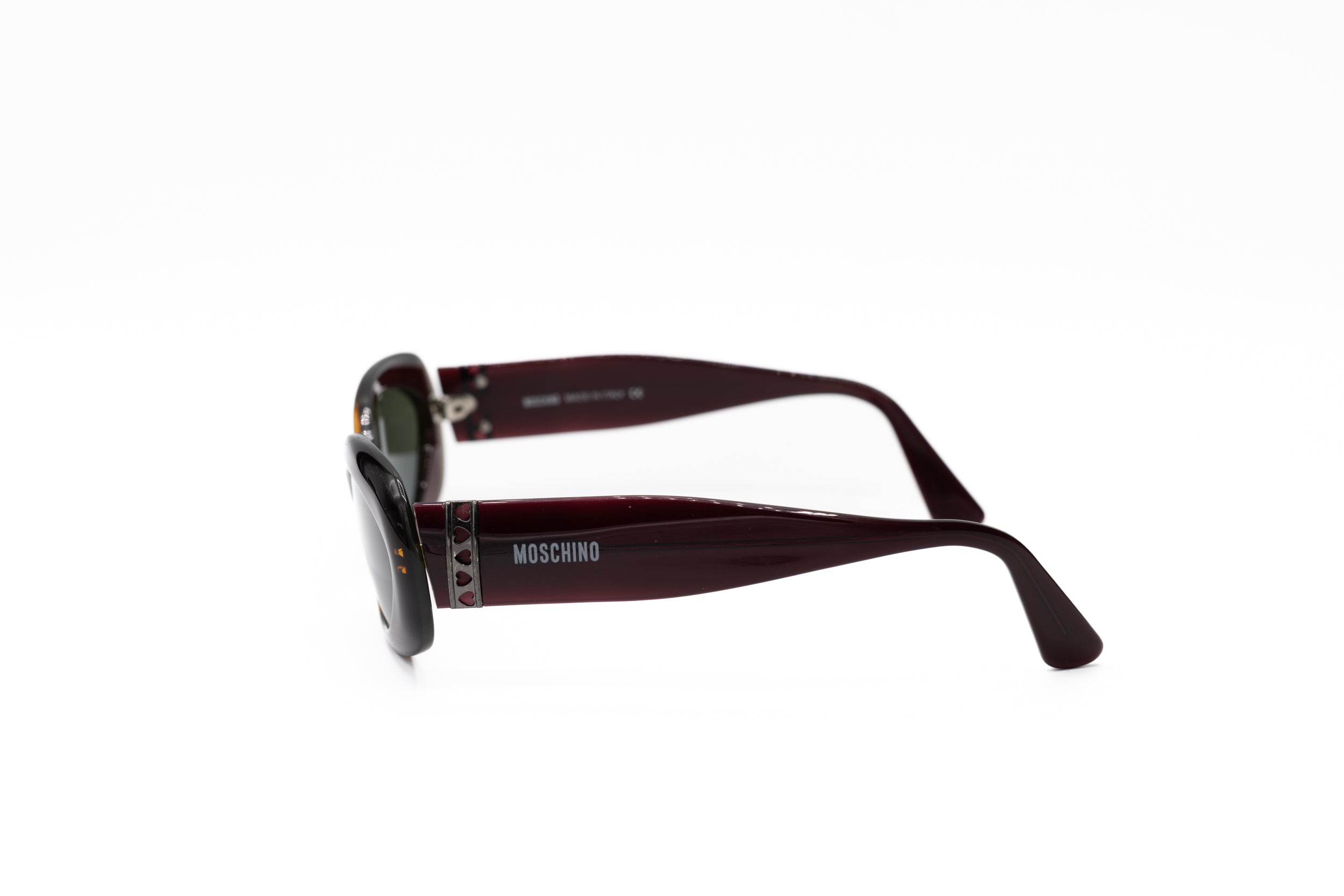 These women's vintage Moschino sunglasses feature a unique oval shape with cat eye traits in catchy bordeaux. The frame owns a true 90s feel, given by the contrast of the colors and the thickness of the rims and temples.