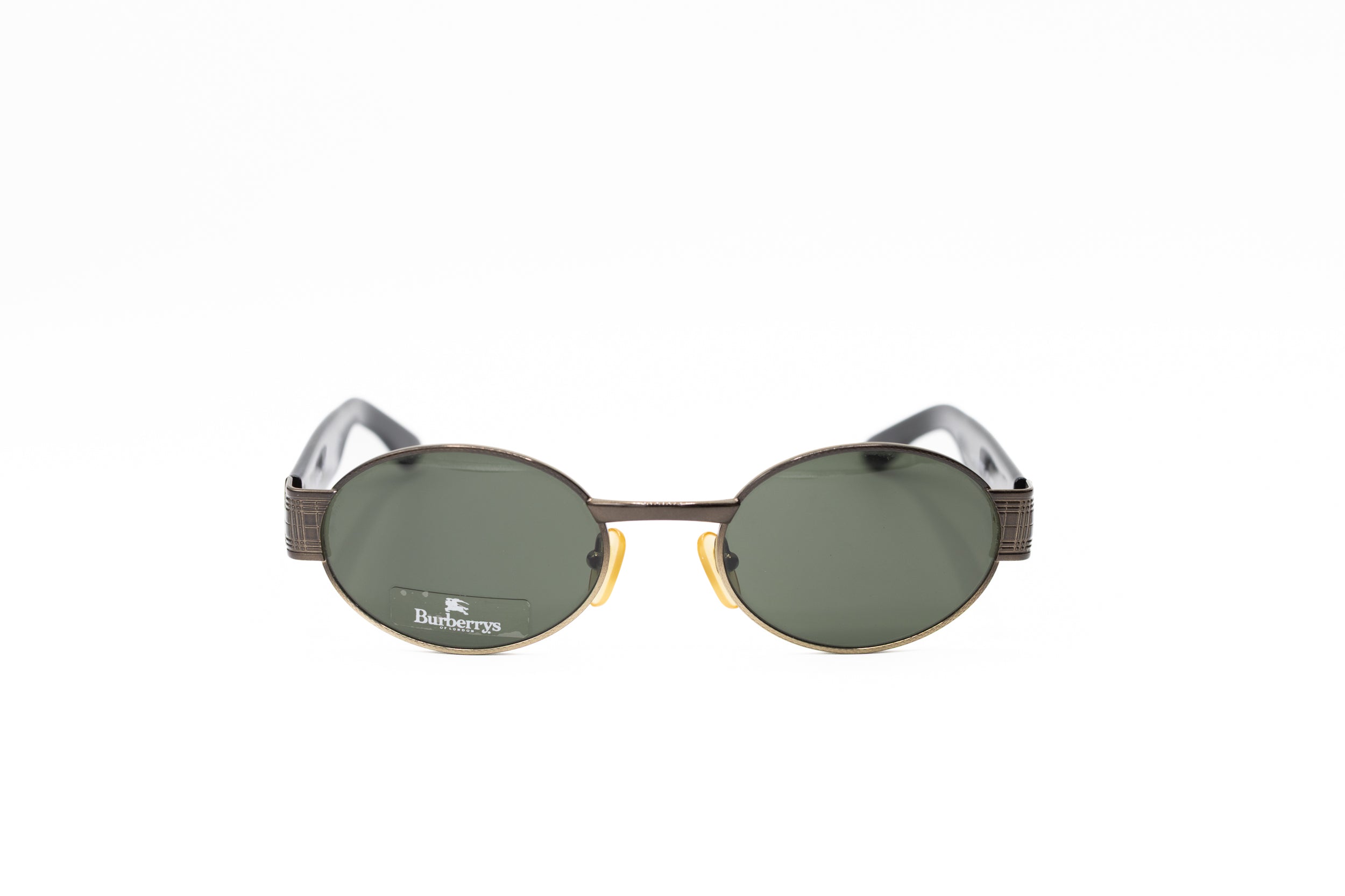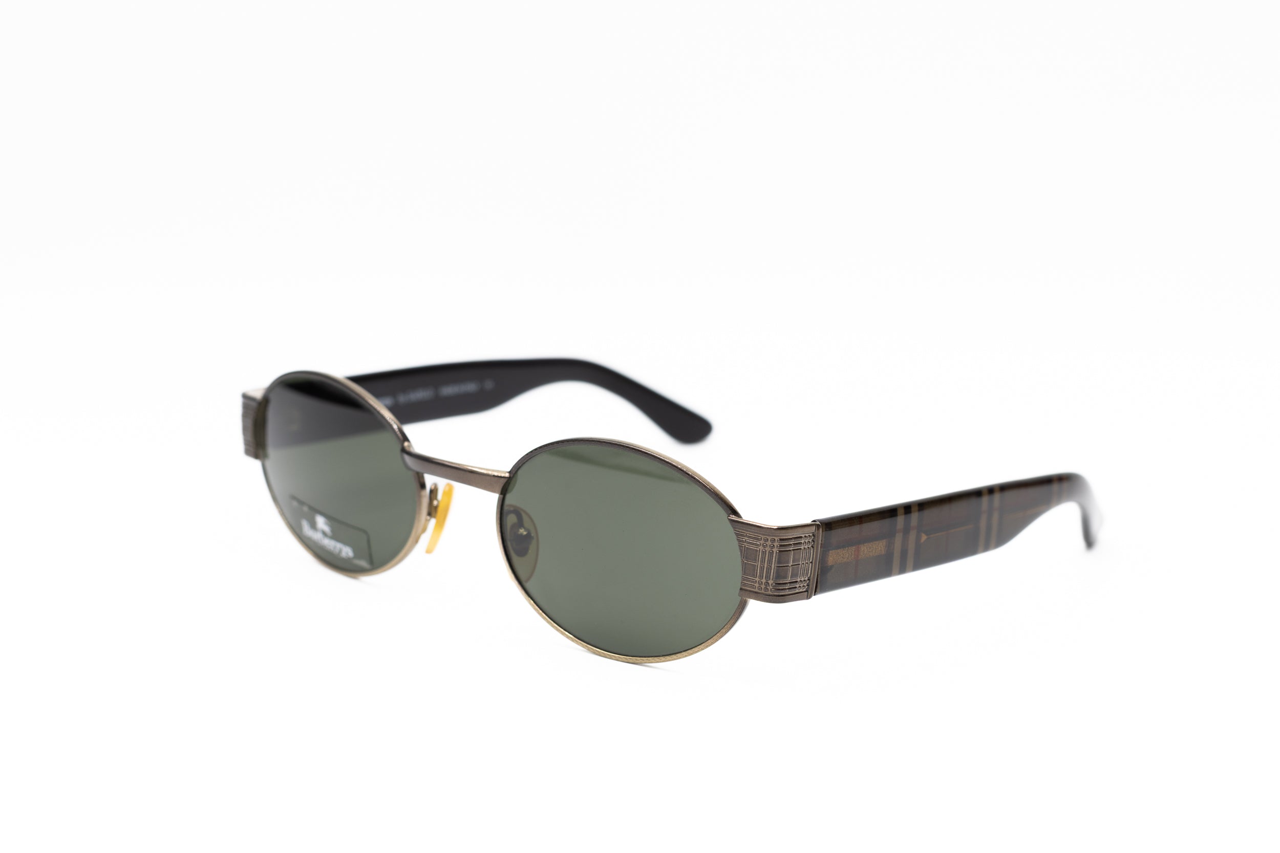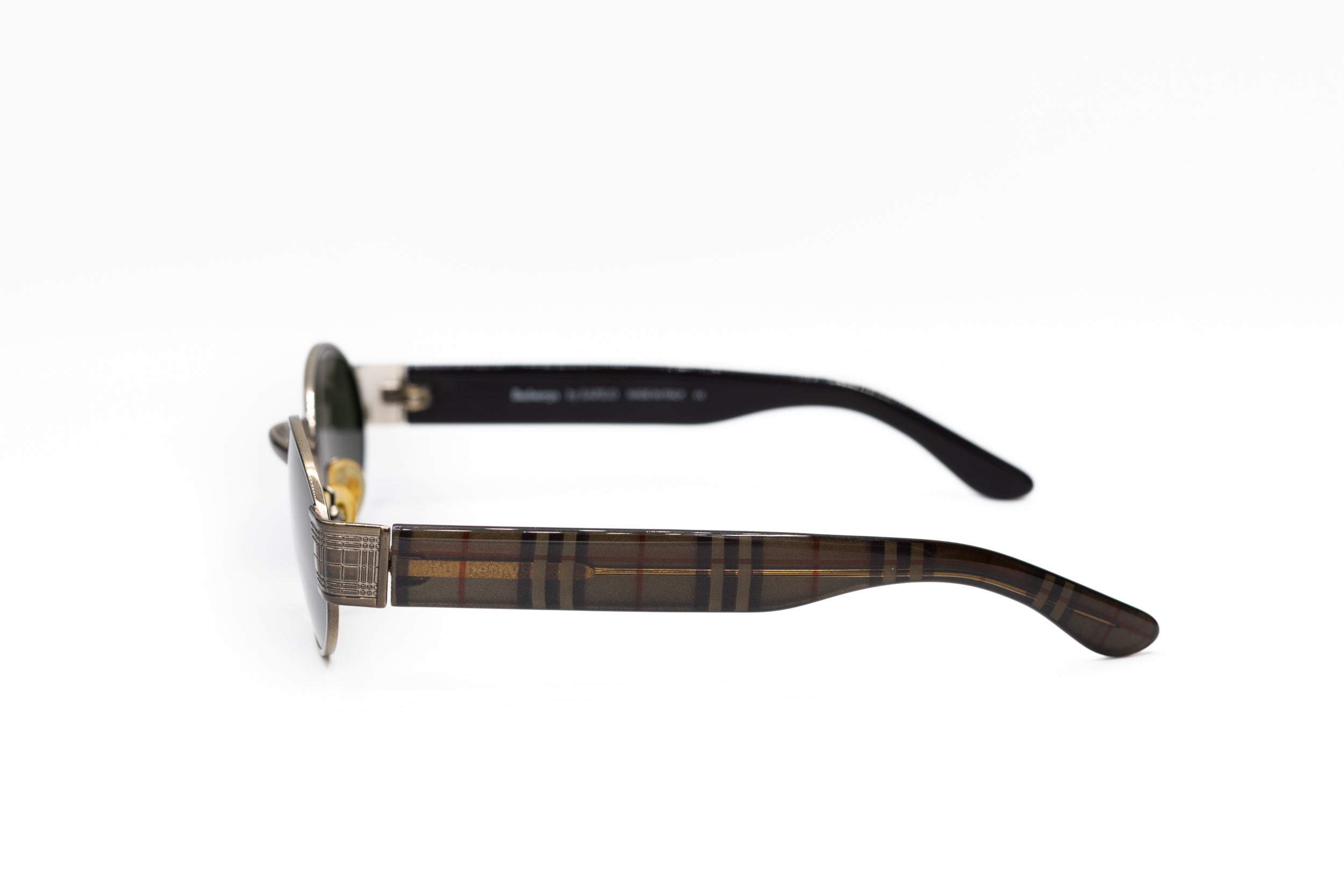 Vintage Burberry sunglasses from the 2000s with a sleek oval silhouette and dark lenses. The clean, minimalist front is contrasted by temples detailed with Burberry’s iconic check pattern, adding a subtle yet unmistakable signature.