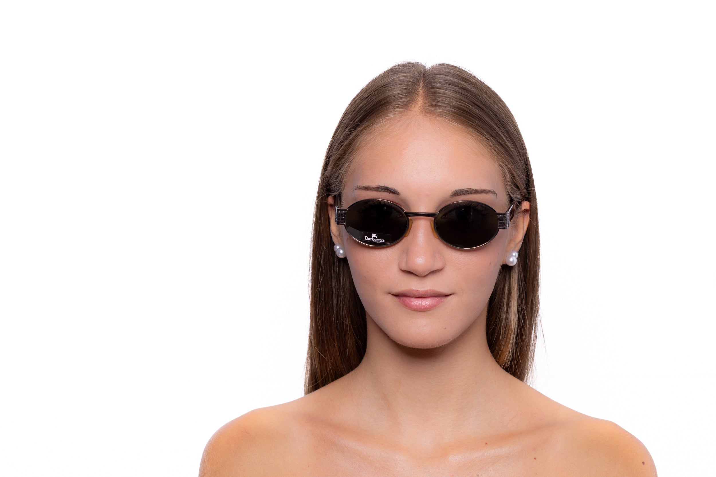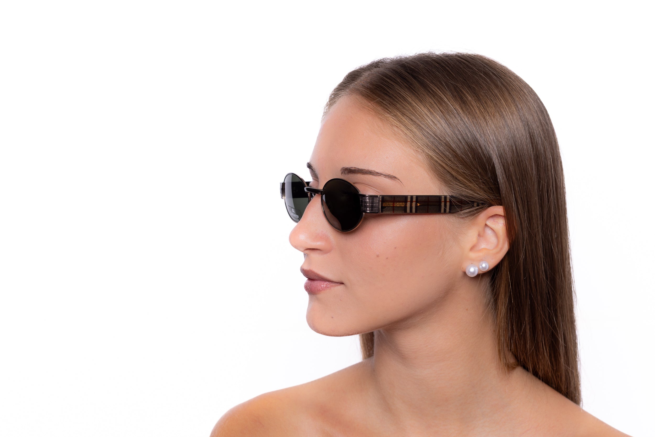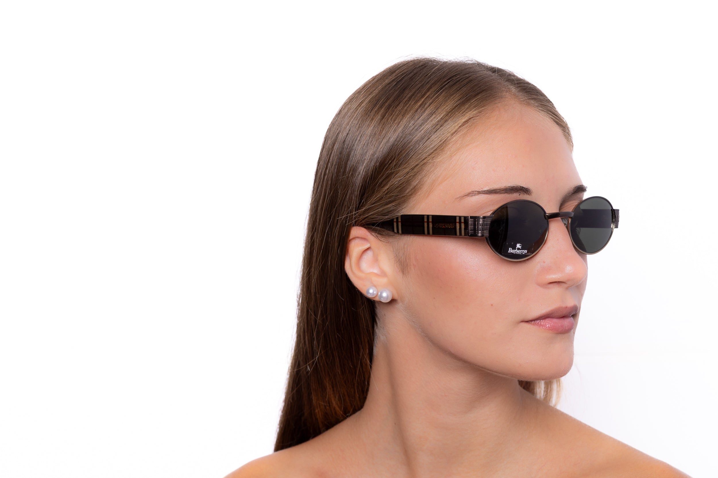 Vintage Burberry sunglasses from the 2000s with a sleek oval silhouette and dark lenses. The clean, minimalist front is contrasted by temples detailed with Burberry’s iconic check pattern, adding a subtle yet unmistakable signature.
