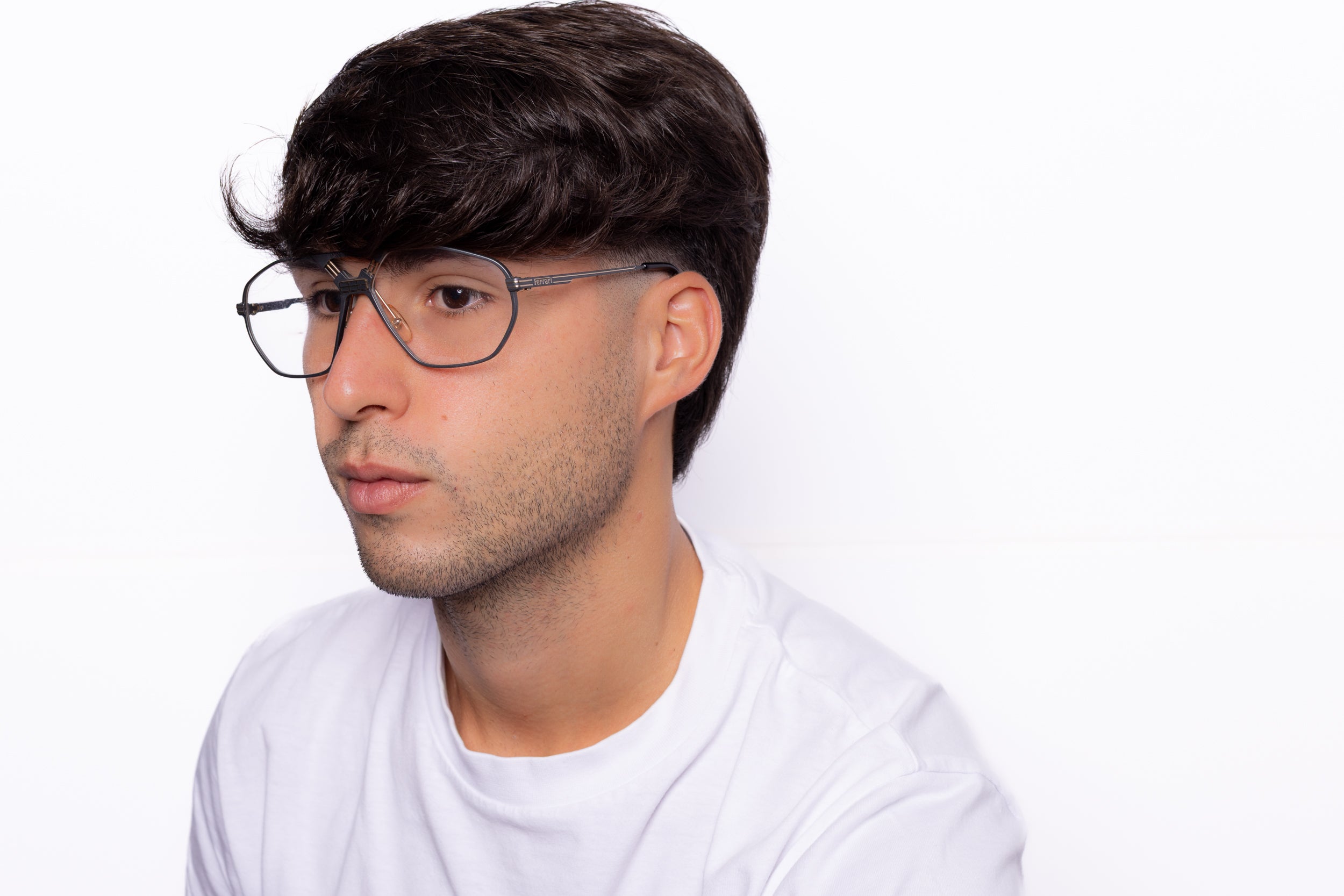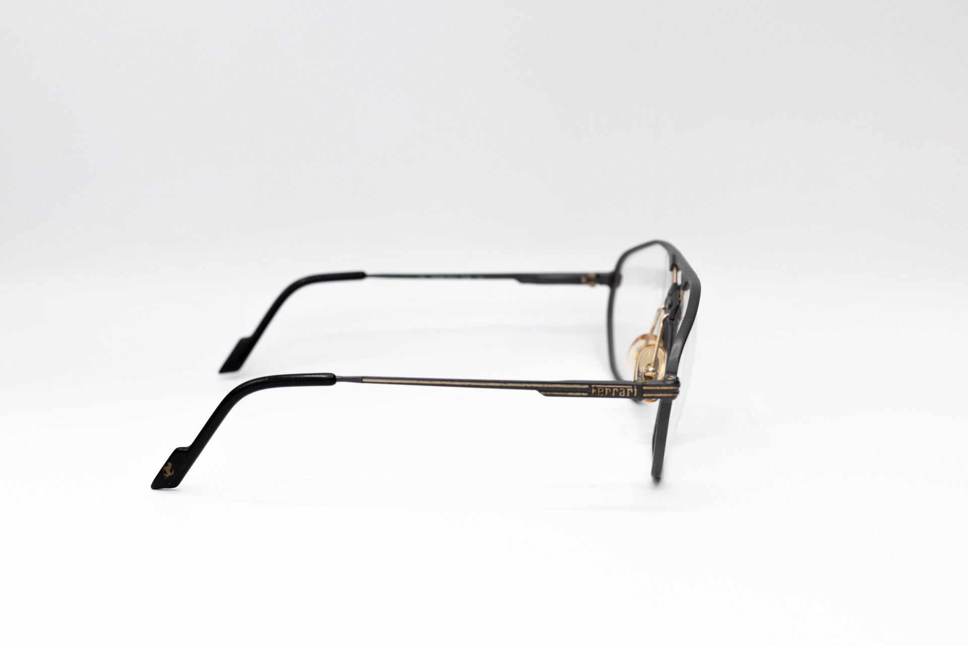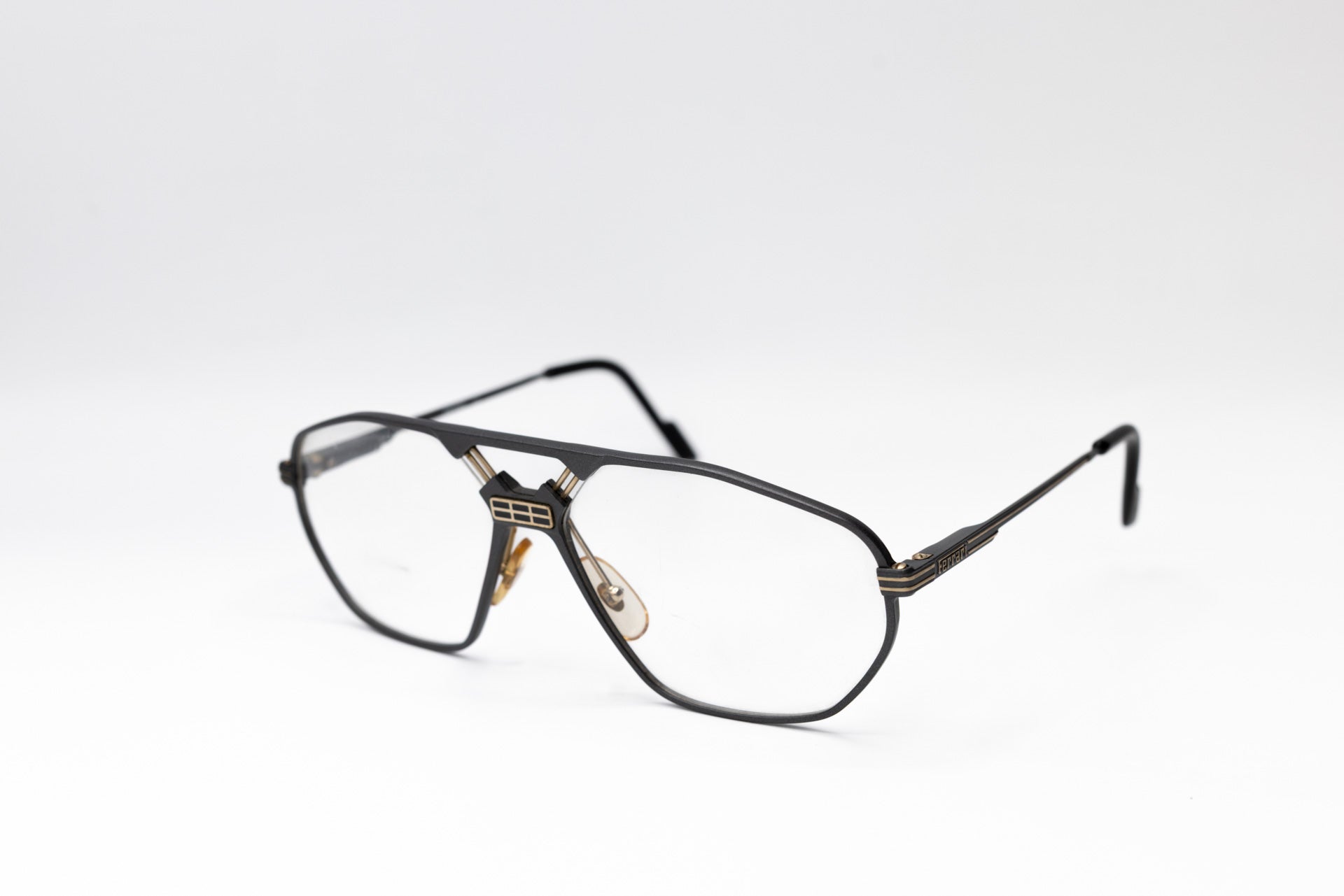 Stunning pair of vintage eyeglasses by Ferrari, featuring an aluminium frame in gray enhanced by a double bridge with the iconic Ferrari logo. A unique piece with timeless flair.