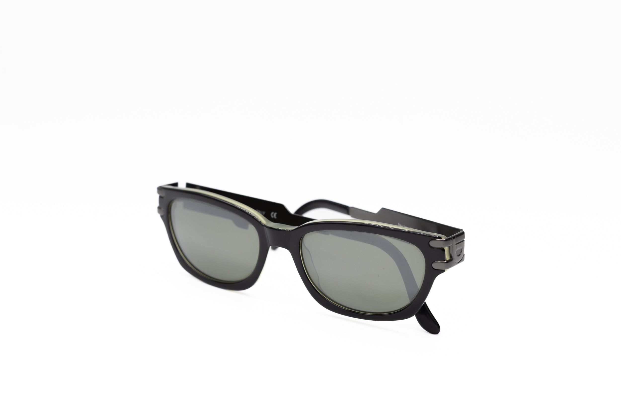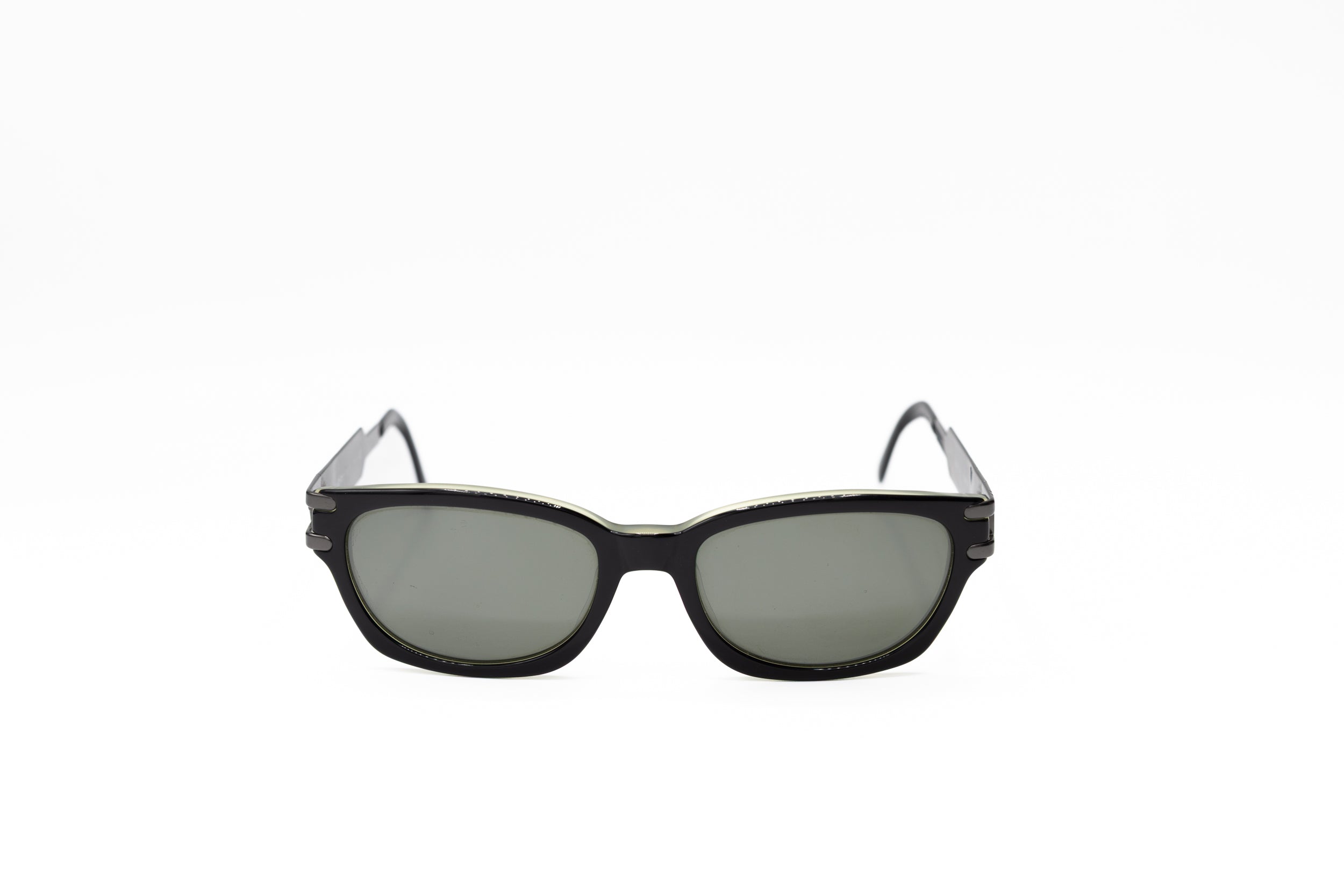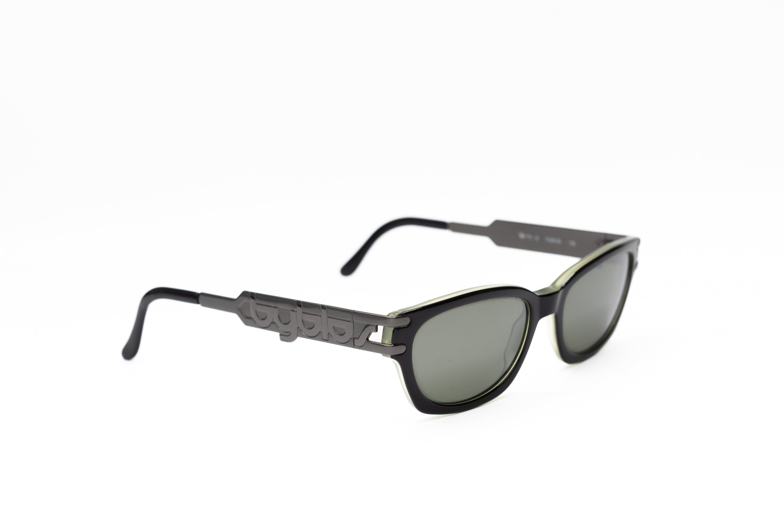 90s vintage Byblos sunglasses, featuring an squared frame in black plastic and temples in smoke grey metal, enhanced by the iconic BYBLOS logo embossed on the sides.