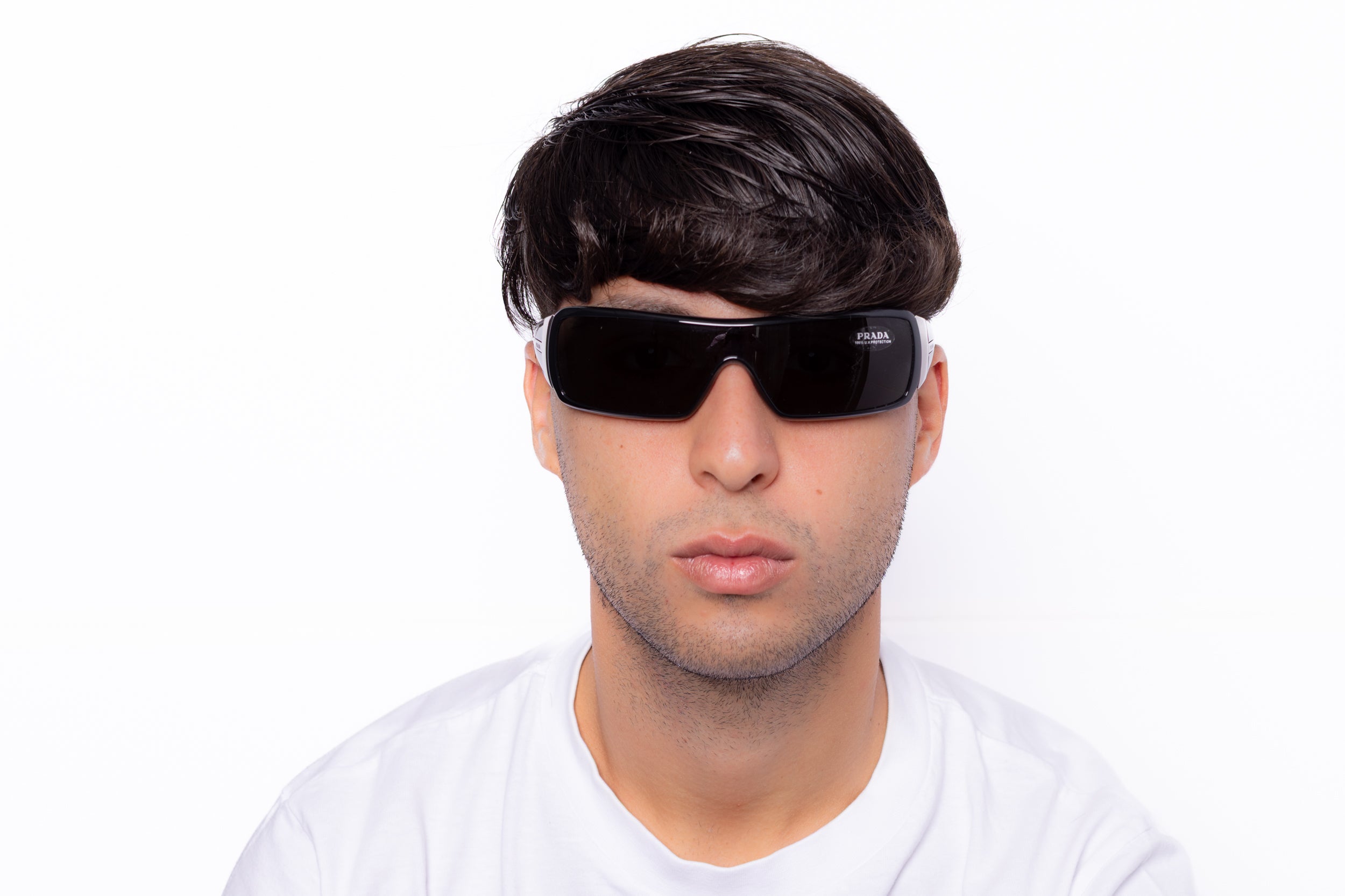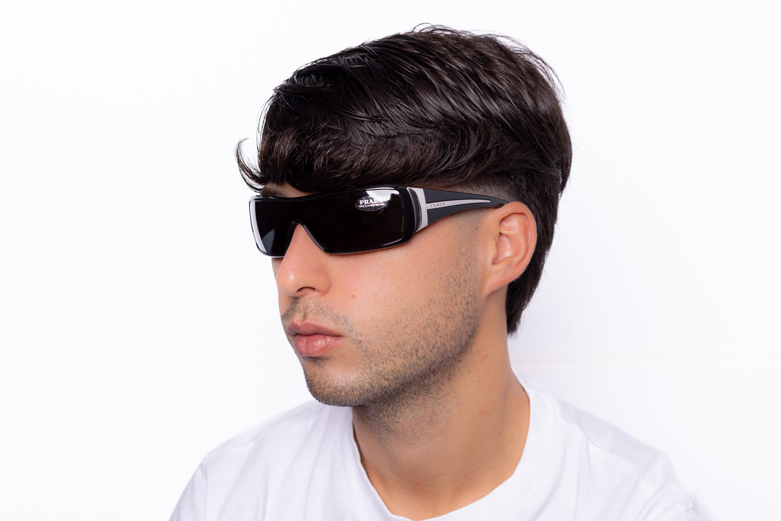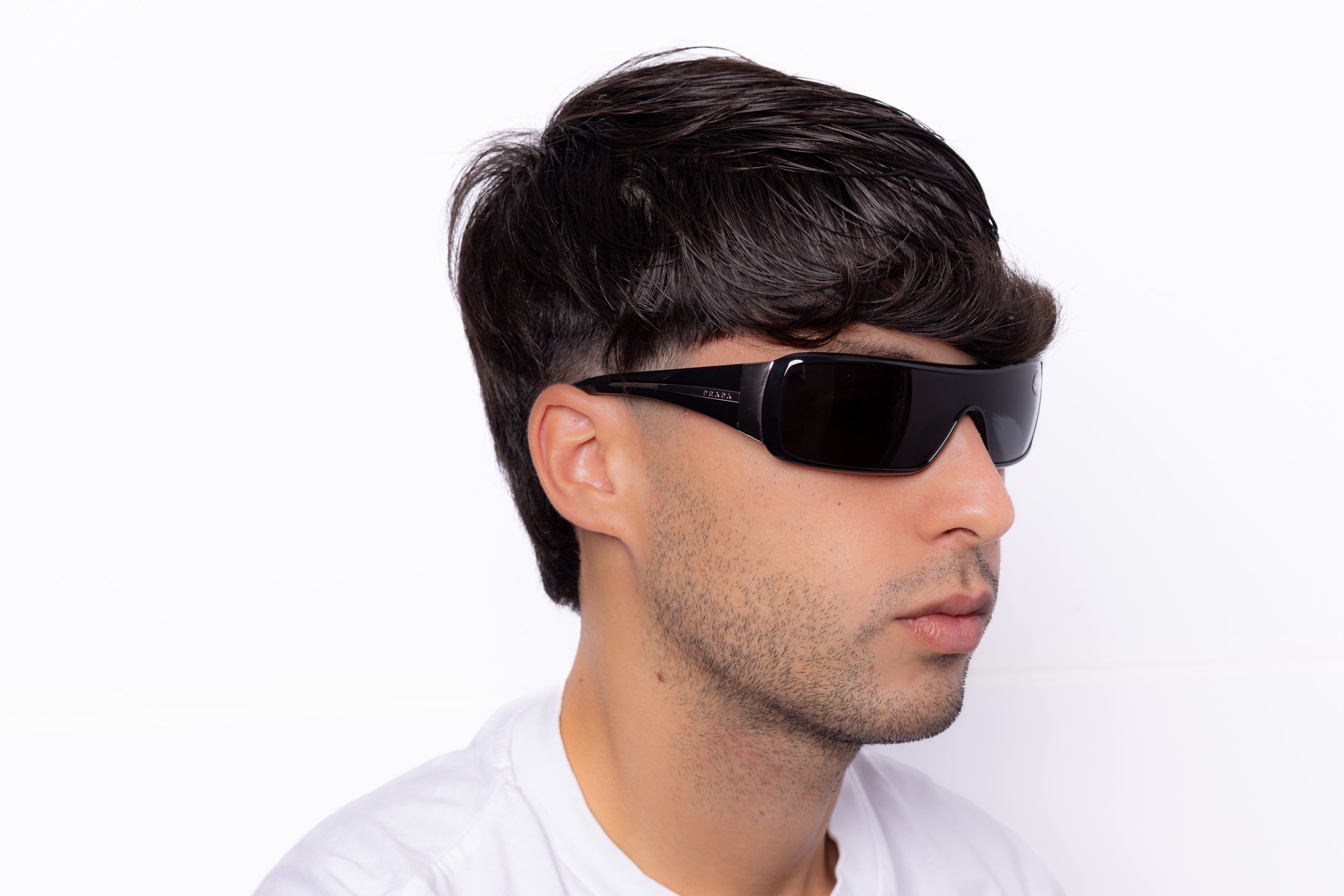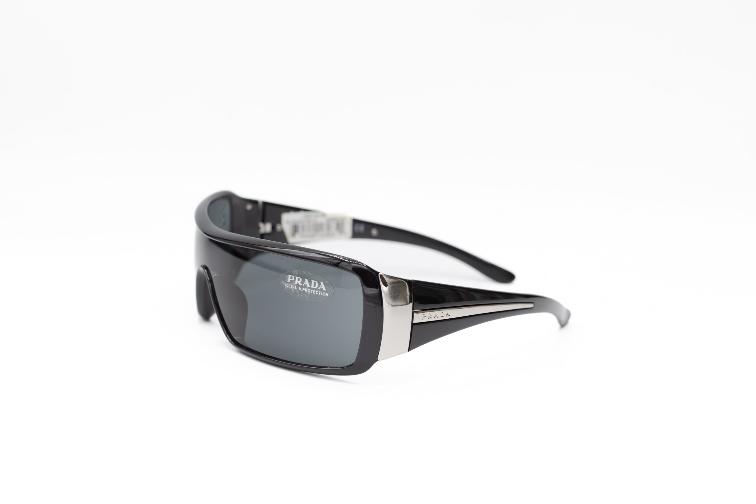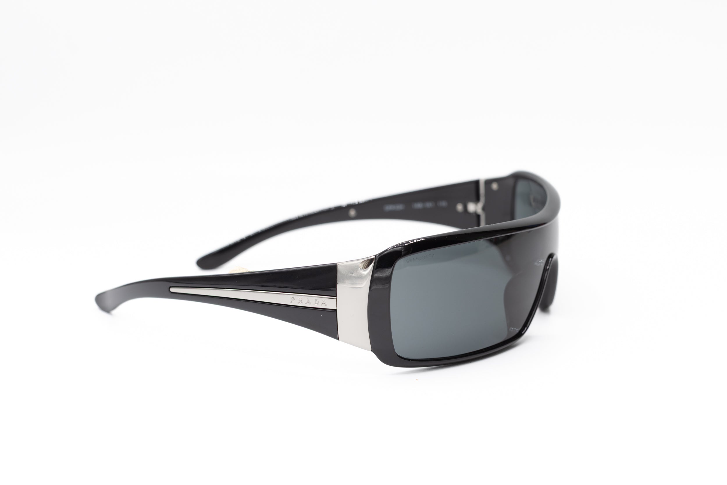 2000s Prada sunglasses featuring a wrap shield frame in black acetate, enhanced by details in silver metal on the temples.